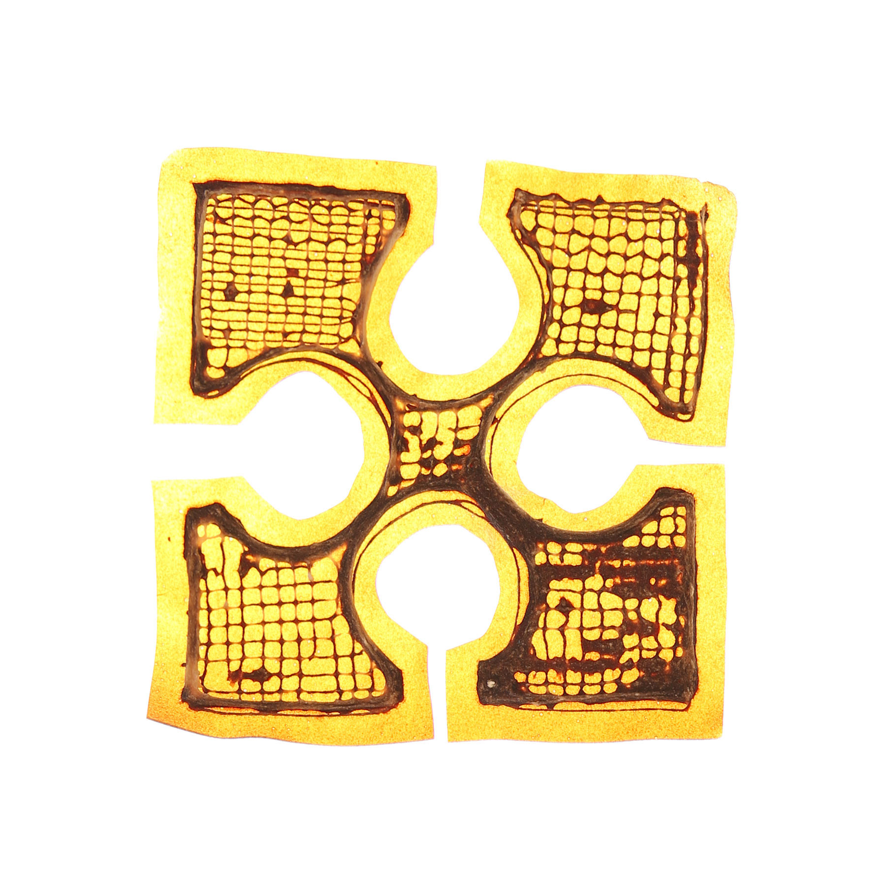 These experiments examine how different material formulas, print orders and toolpaths can affect deformation over time. Each material formula is printed with a base layer of pectin in a 5 ½” cross shaped swatch with a parallel infill toolpath. A layer of cellulose hydrogels is printed with variable density lattice patterns. In select swatches a 3rd layer of pectin hydrogel is printed either on top or below the cellulose layer. The breaks in the geometry of the X shape are intended to allow the surfaces to exhibit greater shape change over time. The collection of different swatches is then exposed to air.